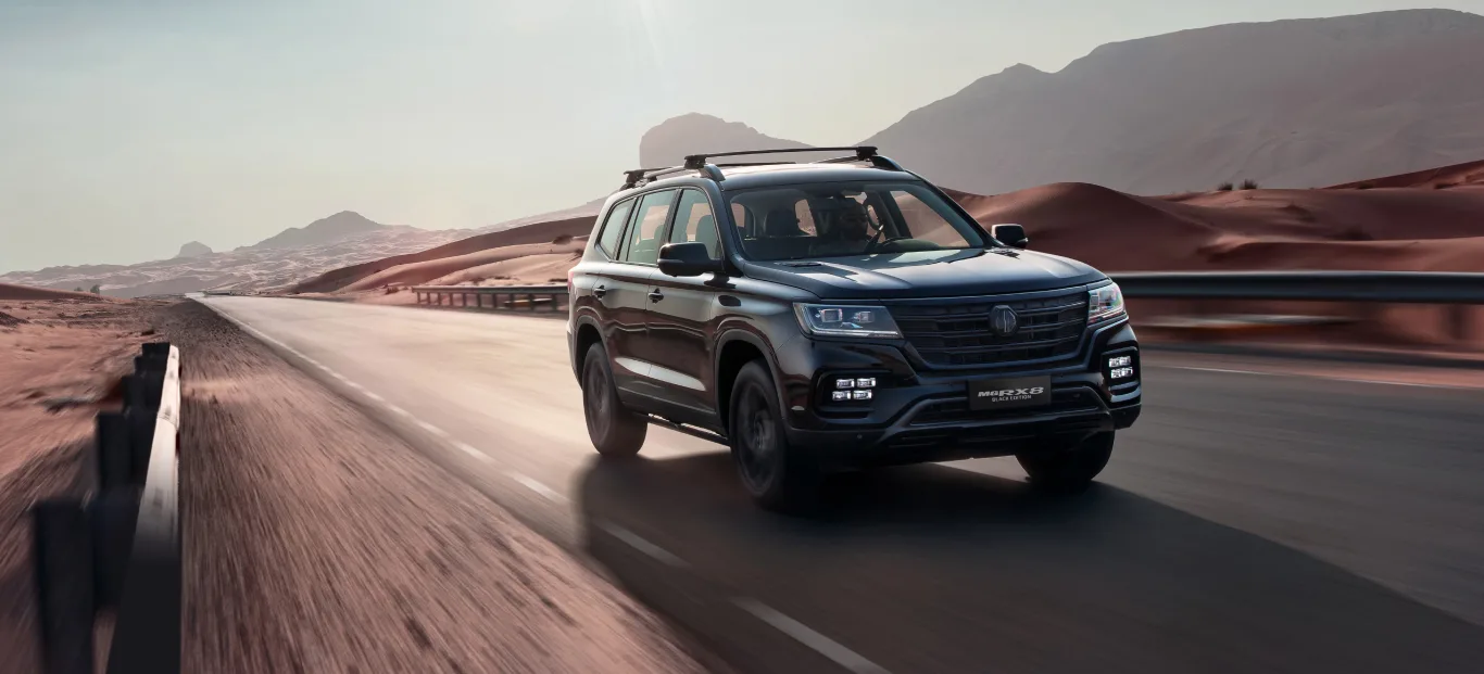ام جي rx8 هي سيارة اس يو في متوسطة الحجم تتوفر لدى شركة تأجير للسيارات بثلاث فئات، تأتي مع نظام دفع رباعي أو كلي الأول يمنحها تسارع ومتعة قيادة والثاني يمنحها أداء عالي على الطرق البرية حيث يمكن تعديل عزم الدوران في غضون 0.1 ثانية عند الطلب، وتتميز بشاسيه منفصل مرتفع عن الأرض ويمكنها خوض المياه بعمق يصل 800 مم مع جنوط عجلات 18 أو 20 بوصة مصنع من الألمنيوم. تأتي المقصورة مع 3 صفوف من المقاعد تكفي 7 ركاب، بكسوة من فرش القماش أو الجلد، تتميز بالمقاعد الأمامية الداعمة للتدفئة والتهوية في الفئة العليا، و توجد في المقصورة 37 مساحة تخزين مختلفة، وبالنسبة لأنظمة مساعدة السائق فتشمل كاميرا الرؤية الخلفية وحساسات الركن الأمامي والخلفي.